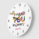 Obrigado Mamãe imagem decorativa sobre o fundo branco. Uma borboleta colorida senta na letra "T". Um nome de modelo sob a imagem. Relógio de parede totalmente personalizável. Você pode alterar o texto colorido da imagem, alterar os números de discagem, alterar a borboleta e colocar algumas fotos em vez dela, e pode alterar ou excluir o nome do modelo. Use o botão "Editar Design" para alterar o tamanho da imagem de texto, realocar a borboleta ou para alterar a cor do plano de fundo, tipo de fonte, tamanho e cor. Divirta-se, personalize-se e comprar um, e seja feliz!