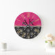 Este elegante e glamouroso relógio de parede personalizado apresenta um design brilhante e brilhante. A parte inferior apresenta um padrão de almofada tufada preto acentuado com diamantes. A parte superior apresenta um padrão de couro rosa-quente. As iniciais do monograma de amostra são impressas no centro. Os números são impressos como uma folha de ouro falsa em algarismos romanos.