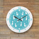 Um padrão branco e teal de gatos-da-silhueta sentados é o pano de fundo para este relógio de novidade fofo. Um anel externo branco guarda números de lacas correspondentes nas posições 12, 3, 6 e 9, com pequenas patas de gatos nas posições restantes. *Obrigados para ThingsByLary para o padrão neste design.
