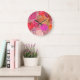 Padrão floral multicamadas com flores coloridas e ramos em fundo cor-de-rosa