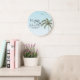 Este relógio de parede personalizado apresenta um tema tropical para um destino ou um simples casamento na praia. Imagem à direita de uma palmeira, com um bando de pássaros voando acima. O fundo é um gradiente azul-céu. Os nomes do casal são impressos à esquerda em uma letra elegante, seguida da data e do local do casamento. Faz uma maravilhosa manutenção e adiciona um toque artístico a qualquer sala.