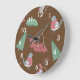 Um relógio de Natal marrom com um charmoso design de árvores de abeto, pássaros vestidos em suéteres com algas, folhas verdes e ocas, espíritos de bagas sagradas e mangas cheios de presentes de Natal para adicionar um toque único e caprichoso à sua casa este Natal.
