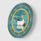 Esta é uma foto natural de um pato Pequim branco nadando em um lago urbano com reflexos turquesas e ondulações de água. A fotografia do animal foi aprimorada para criar um efeito pareado, enquadrado com um círculo amarelo, e números brancos para a face do relógio. Uma ideia divertida para decorar sua casa ou escritório.