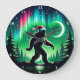 Relógio único com um Pé Grande Festivo vestindo um chapéu de Papai Noel, colocado contra uma vibrante cena de aurora borealis adornada com charme noturno e árvores verdes sob a lua crescente.