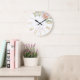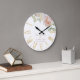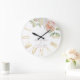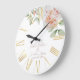 Este romântico relógio de manutenção de casamento apresenta um elegante e simples fundo branco com pêssego aquarela e flores brancas. Um delicado buquê floral é ilustrado no topo. Os nomes de exemplo de um casal são impressos abaixo em uma fonte de script elegante.