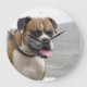 Cachorro bonitinho na praia com a língua saindo.
