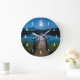Um relógio com uma bela fotografia de um píer de madeira esticado sobre um lago calmo. O céu noturno coberto de estrelas e uma bela lua de cheio.