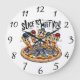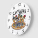 Este relógio de parede circular apresenta três fatias de pizza animadas, cada uma vestindo um boné e calçados de baseball, dançando alegremente em uma pizza maior. A frase "SLICE TO met You" é exibida em vermelho sobre a festa da pizza. O fundo é branco limpo.