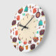 Potes e panelas, jarro, pote de café, taças e utensílios de fruta, estilo retrógrado muito bonito, em um relógio de cozinha, com um colar roxo e cor-de-rosa, com entalhes de hora em castanho.