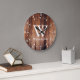 As pranchas de madeira do celeiro do marrom escuro imprimem o pulso de disparo com numerais romanos brancos e tiquetaqueiam marcas para horas e minutos mais seu nome de família personalizado da letra e do cheio do monograma no branco.