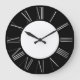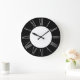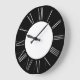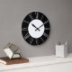 Este elegante e glamouroso relógio de parede apresenta um simples tema preto e prateado. O centro apresenta um simples fundo branco. A estrutura externa é um preto sólido. As horas são impressas como algarismos romanos numa folha de ouro brilhante.