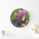 Hyacinth rosa e Muscari roxo/azul florescem neste relógio de parede
