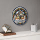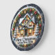 Este relógio festivo apresenta uma encantadora cena de inverno com uma casa decorada coberta de neve e luzes de Natal. A casa é cercada por pinheiros cobertos de neve e é enquadrada por uma coroa de terra, morangos vermelhos e ornamentos. A face do relógio, que é azul escuro com flocos de neve, também apresenta a frase "Primeiro Natal em Nossa Nova Casa" no fundo. As mãos do relógio são pretas e apontam números que são iluminados pelo brilho das luzes ao redor.