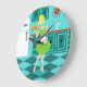 Com este pulso de disparo de parede acrílico redondo da cozinha retro, você pode comer sua torta e comê-la, demasiado. Este desenho kitschy, minimalista da arte caracteriza uma dona de casa perfeita dos anos 50, em sua cozinha moderna do meio século. O padeiro bonito está vestindo um flouncy, o vestido do verde e um avental branco com detalhe vermelho. Não um cabelo em sua cabeça loura é fora do lugar. Em uma mão, está guardarando a fruta de seu trabalho--uma lindo, estrutura cobriu, torta da fruta. Uns relance e você saberão que suas crostas de torta flocosos são em segundo a nenhuns. Está estando em um assoalho do tabuleiro de damas do aqua e da cerceta, de que esteja indubitàvelmente limpo bastante comer fora. Contra uma parede do aqua, nós vemos o cabinetry da cerceta com trabalho da guarnição do aqua, uma bancada vermelha, trações vermelhas da gaveta, e acentos pretos do starburst. Um vermelho, pulso de disparo do starburst está pendurando na parede. Ao lado, há um refrigerador avançado, branco com punhos de prata. Pelo menos, o refrigerador era in 1950 avançado. Agora, é apenas sonhador liso! Se você é Homemaker de Suzie ou tem simplesmente uma afinidade para todo o vintage das coisas, você é certo amar esta fatia deliciosa de americana.