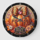 Este incrível relógio de parede apresenta uma grande abóbora laranja adornada com um arco de impressão na moda-leopardo e joias espumantes. Cercado por flores e folhas vibrantes, um sinal de "WELCOME FALL" é exibido de forma destacada. Este relógio elegante é perfeito para adicionar um toque de charme de outono e festividade sazonal a qualquer decoração caseira. Edite a cor dos números de relógio na ferramenta Design para as cores favoritas.