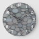 This beautiful clock is perfect for any decor needing a little outdoors elegance. It features background artwork depicting round river pebbles in different shades of gray and muted colors from blue and green to gold and pink. Very natural and serene. The hours are marked with numbers in a rustic font in white.