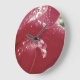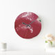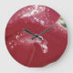 Grande relógio de parede redonda, com uma tomada de chuva para cima próxima nas pétalas de rosa vermelha bonito.