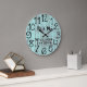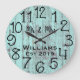 Um belo, único, design personalizado de um tipo personalizado apresenta um preto personalizado seus nomes em um design de sobreposição de fontes de script e o sobrenome e ano estabelecidos em um roteiro em negrito com um fundo azul-lacrimogêneo de madeira em apuros. Personalize este relógio adicionando suas informações pessoais. Faz um excelente de casamento, aniversário ou presente de inauguração. Clique em "personalizar este modelo" para alterar os nomes, as fontes e as cores para criar um design único de um tipo. Que acessório elegante e rústico para sua sala de estar, quarto ou sala de família. Se precisar de ajuda para personalizar, envie-me um e-mail para o site @gmail.com. Obrigados para parar em www.zazzle.com/Personal_Creations. ©Karen Hall para Personal_Creations no Zazzle.