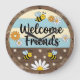 This charming round wall clock features a cozy, rustic design perfect for a farmhouse kitchen or entryway. The clock face is divided into a light blue and cream striped upper half and a weathered dark wood-grain lower half. Adorable cartoon honey bees with friendly smiles fly among scattered white and orange daisies across the entire surface. Centered in bold, black cursive script are the words "Welcome Friends," creating a warm and inviting atmosphere for any home. The perimeter is styled with a distressed wood-plank look and features simple numeric markers for easy timekeeping. This functional home accessory is an ideal housewarming gift or a seasonal spring decoration. Its blend of whimsical character art and classic rustic textures provides a cheerful and welcoming focal point for your interior living space.