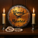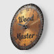 This image features a round wall clock designed to look like a distressed, metallic circular saw blade with a warm, coppery tone. The clock face has a brushed, textured appearance in shades of orange and brown, suggesting aged metal, with some visible scratches and wear. The outer edge of the clock forms the jagged teeth of a saw blade, rendered in a darker, rusty brown. The words "Wood Master" are boldly inscribed in the center of the clock face in a strong, dark script. "Wood" is in a larger, flowing script, while "Master" is a larger, more structured script below it. The numbers 1 through 12 are visible around the clock face in a dark brown, matching the text. The clock has black hour and minute hands. This clock is ideal for a woodworking shop, a garage, or as a unique gift for a carpentry enthusiast.