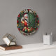 This humorous, rustic clock features a startled Santa Claus peeking around a green door, holding a lantern and looking down at a pile of colorful Christmas ornaments and a small reindeer plush toy. The words "OH NO" and "NOT YOU AGAIN" frame the scene, which is bordered by a festive garland of pine and poinsettias. The design may look real due to the high detail and three-dimensional texture in the artwork.