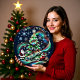 This modern, artistic clock features a stylized Christmas tree formed by glowing, swirling rainbow-colored ribbons of light, set against a dark, starry night sky with large snowflakes. A traditional Santa Claus stands to the left holding a staff, next to a large sack filled with gifts, with the words "MERRY CHRISTMAS" scripted above. The design may look real due to the high detail and three-dimensional texture in the artwork.