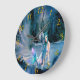 Sereia com cabelos turquesa numa rocha com um castelo atrás dela. Que tem uma cachoeira levando ao fundo do mar oceano.
