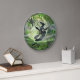 Um design gráfico verde de Natal de uma lua de cheio e uma silhueta de uma bruxa voando na frente dela. Uma aranha está caindo e há teias nos cantos. Um rosto preto do relógio numérico romano foi adicionado para criar um presente exclusivo para sua casa ou escritório. Opcionalmente, você pode personalizar este design digital clicando no botão 'Personalizar' para adicionar texto ou trabalho de arte.