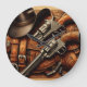 Uma pintura com dois revólveres e um chapéu de cowboy, capturando a essência do oeste selvagem.
