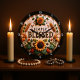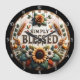 Esta é uma encantadora, rústica ilustração circular com a frase "SIMPLY BLESSED" em letras negrito, tridimensionais. O fundo é um design branco de prancha de madeira com uma borda marrom e branca. O texto central é enquadrado por uma bela coroa de elementos autóctones, incluindo um grande girassol, margaridas, pedúnculos de trigo e várias folhas em tons de terra. O design inteiro tem uma estética quente, ao estilo da fazenda.