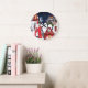 Festive Sinterklaas wall clock featuring Saint Nicholas on horseback and a traditional Dutch rooftop scene with a drummer Piet under a snowy night sky. Perfect for celebrating December 5th, Dutch holiday décor, children's rooms, or cozy winter interiors. A charming nostalgic illustration ideal for Sinterklaas lovers and seasonal home decoration. Original artwork by Caroline Bonne Müller