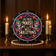 Este gráfico branco redondo apresenta dois esqueletos estilizados em chapéus de topo, segurando flores. O texto, "NESTA ASSEMBLEIA NÓS DANÇAMOS COM ESQUELETÕES", está no centro. Os esqueletos são colocados sobre um fundo de xadrez roxo e preto, com uma ornamentado de borda rosa e lacrimejada, criando um Halloween divertido e festivo ou Dia da decoração dos Mortos.