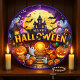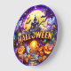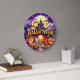 Este relógio festivo do Dia das Bruxas apresenta um castelo assombrado no centro, com uma lua de cheio gigante e morcegos voando pelo céu atrás dele. A cena é colocada em uma noite escura e misteriosa, cercada por lanternas brilhantes e fantasmas bonitos. A face do relógio é enquadrada por uma vibrante borda roxa e apresenta um grande e estilizado sinal "HAPPY HALLOWEEN". A atmosfera geral é assustadora e comemorativa, com estrelas e teia-aranha se somando ao tema do Halloween.