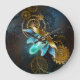 Barbeiro véu com asas transparentes azuis e lâmpada verde sobre fundo vestido, marrom, texturizado. Estilo Steampunk.