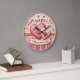 This charming round wall clock features a whimsical 3D-style digital illustration with a cozy, handcrafted aesthetic. The design showcases two large, layered hearts made of pink quilted fabric and striped patterns, complete with decorative buttons and delicate stitching details. The word "HAPPY" is displayed in raised red lettering at the top, while a flowing parchment banner at the bottom carries the elegant message "Valentine's Day." The background consists of rustic white wooden planks adorned with small floating pink hearts and delicate floral vine accents. The perimeter is finished with a soft pink frame, and a pink-and-white plaid pattern decorates the lower section. This functional home accessory is a perfect gift for Valentine Day or anniversaries, adding a touch of shabby chic romance to any bedroom, kitchen, or living space.
