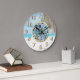 Relógio redondo de parede acrílica de 10,75 pol. com uma colagem de lindas pedras de gema, conchas e uma sereia prateada com borda de ouro em fundo de aquarela azul. Veja toda a coleção de trava marítima do DÉCOR | Seção Relógios.