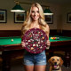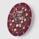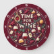 This is a colorful, decorative wall clock with a rich maroon background. The phrase "TIME FOR WINE" is centralized in large, three-dimensional light-colored letters. The entire clock face is densely decorated with flat illustrations of wine bottles, filled wine glasses, clusters of red and white grapes, and various cheese wedges. The items are scattered across the face with a light border separating them from the maroon outer rim. The design may look real due to the high detail and three-dimensional texture in the artwork.