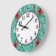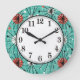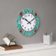 Relógio redondo de parede acrílica de 10,75" com uma imagem em estilo 50 de órbitas brancas e vermelhas com tomadas de estrelas pretas em turquesa, e uma face de relógio com números grandes e legíveis em um círculo branco com uma borda preta. Veja toda a coleção Nifty 50 Clock no DECOR | Seção Relógios. Este produto não está associado nem afiliado ao titular original dos direitos de autor.