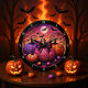 Esta ilustração circular, branca, apresenta uma variedade de abóboras decoradas ornamentosamente em vários tons de laranja, roxo e rosa. A maior abóbora é amarrada com um arco estriado preto e rosa. A cena assustadora inclui morcegos, aranhas em uma teia, e uma lua de cheio sob um vibrante céu roxo e rosa-noite.