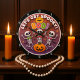 Esta é uma ilustração circular divertida e caprichosa com um tema de desenho animado assustador. Ele apresenta três esqueletos dançantes vestindo gravatas arcos coloridas, reunidos em torno de uma grande abóbora. O fundo tem uma grande lua amarela com um morcego voando sobre ele, e a frase "VAMOS GET SPOOKY!" é escrita em uma fonte divertida no topo.