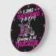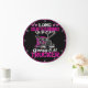 Este relógio de parede humorístico é projetado para o paciente parceiro de um motorista de caminhão. Ele apresenta um caminhão cor-de-rosa contra um fundo preto, todo emoldurado por uma jante rosa brilhante. O texto "LONG SOFFERING Wife Of A Grumpy Old TRUCKER" é exibido em uma mistura de fontes brancas e rosadas angustiadas com sotaques estelares, fazer uma declaração espirituosa sobre as realidades de amar um motorista da carreira.