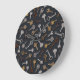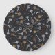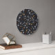 This wall clock features hand-illustrated vintage and antique keys for safes and locks on a dark blue background.