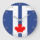 This stylish clock prominently displays Toronto’s iconic city flag design: a crisp white stylized “T” symbolizing the city’s twin towers and unique urban layout, framing a vibrant red maple leaf that proudly represents Canada. The deep blue background, inspired by the waters of Lake Ontario, creates a striking and meaningful backdrop that celebrates both local identity and national heritage.