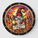 This charming autumn-themed clock features a gnome with a red and black plaid hat, holding a lantern, standing in front of a wooden fence. The background shows a sunset over pine trees with fall foliage. A banner on the fence says "WELCOME FALL". The clock has a black border with numbers 1-12.