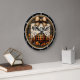 This inviting autumn-themed clock features a large plaid pumpkin front and center, flanked by two smaller plaid pumpkins and fall leaves. A rustic wooden sign with "WELCOME" in a flowing script hangs above, adorned with a large burlap bow. The clock has a rope-like border and black outer rim with white numbers 1-12.
