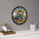This charming autumn-themed clock features a friendly scarecrow wearing a sunflower hat, sitting on the back of a blue pickup truck filled with pumpkins in a sunflower field. A wooden sign reads "WELCOME TO MY PATCH". The clock has a black border with white numbers 1-12.