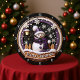Este gráfico circular festivo mostra um charmoso bonitão vestindo um chapéu de xadrez preto e roxo e cachecol. O boneco de neve fica atrás de uma pequena cerca de madeira com as palavras "Feliz Natal" escritas em uma prancha coberta de neve na frente. Uma lâmpada de rua ao estilo vintage ilumina a cena, e grandes flocos de neve decorativos caem contra um fundo escuro, criando uma imagem confortável de férias de inverno.