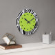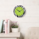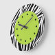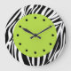 A parede de zebra tem relógios pretos e brancos com listras de zebra na face do relógio e fundo verde nesta design do relógio animal de decor da parede para a sua cozinha, banheiro ou qualquer quarto na sua casa que você queira adicionar alguma cor e personagem. Excelente para afrodescendentes ou amantes da vida selvagem.