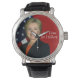 Este relógio apresenta uma imagem de Hillary Clinton, em frente a uma bandeira americana. O texto personalizável diz, "É hora da Hillary". A cor de fundo pode ser personalizada conforme desejado.