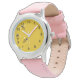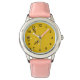 Três abelhas engraçadas voando sobre um fundo amarelo tecido cercado por pontos pretos. Divirta-se passando tempo com este relógio muito fofo!